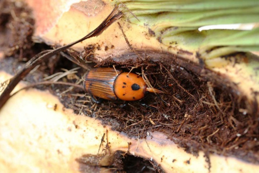 Личинки долгоносика проникают внутрь ствола и питаются там растительными тканями, практически полностью разрушая сердцевину и уничтожая точку роста пальмы.